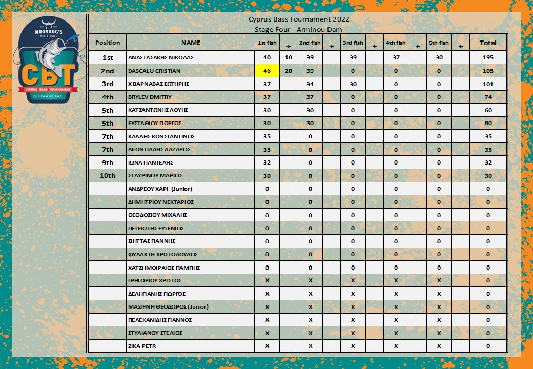 We would like to thank all the participants of the competition and also the referees. We would also like to thank Moondog’s as the official sponsor of the Cyprus Bass Tournament and the sponsors of the Association for the year 2023: EyeSpotCyprus, Rabbit Hop, OutdoorsDirect.eu and the auditing office The Practice.